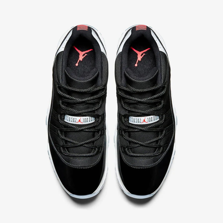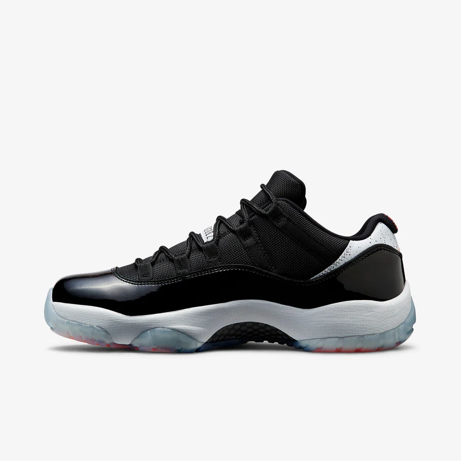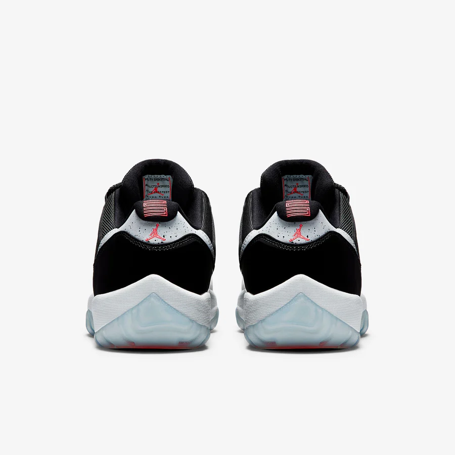 Released in June of 2014. the Air Jordans 11 Retro Low 'Infrared 23' features a black mesh upper with black patent leather. but with the addition of a 'cement' panel around the heel. The sneaker also features infrared accents. a white midsole. and an ice blue translucent outsole.
