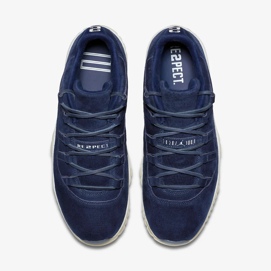 Translating the 2017 'Derek Jeter' high-top into a low-top style. this model sports a Yankee-themed Binary Blue and Sail colorway. The sneaker comes dressed in an entirely suede upper with embroidery of Jeter's jersey number '2' on the back heel. with a clean white coating and translucent outsole rounding out the design. The original model was released in an edition of five and given to five raffle winners for free. Now. the Jordans 11 Retro Low RE2PECT is available to the public.