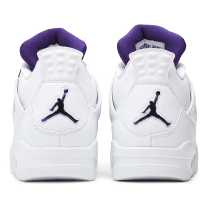 The Air Jordan 4 Metallic Pack - Purple one of four special edition colorways of the iconic model released for summer 2020. Inspired by the original Metallic colorways of the Air Jordan 1, the white and metallic-colored scheme is translated to four editions of the Air Jordan 4, including red, orange, green, and purple. Each colorway was released in specific regions of the world, with the US receiving this purple version. The construction features a full-grain leather upper with a metallic purple finish on the TPU lace eyelets and heel Jumpman logo. A matching purple hue is found on the inner lining, tongue logo, and visible Air unit. The “Metallic Purpleâ€?Air Jordan 4 released on May 20, 2020.