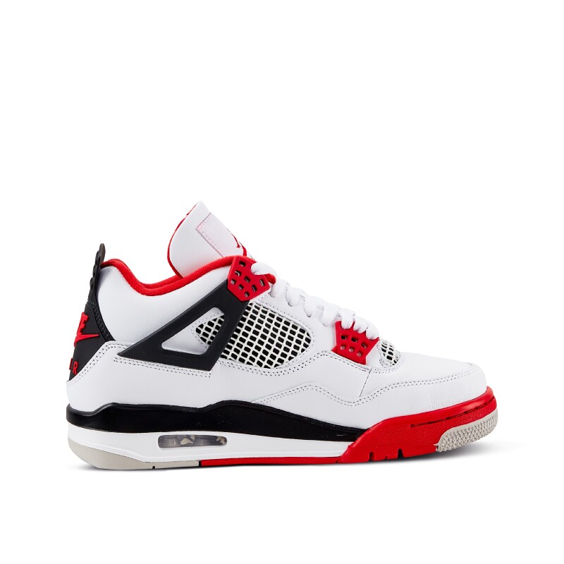 The Air Jordan 4 Retro OG "Fire Red," released in 2020, brings back the OG Air Jordan white leather and accented fire red colorway. The silhouette features original details including the Flight script graphic, signature eyelets and visible heel Air unit. To complete the design, the Nike Air logo is emblazoned in red on the back heel. This throwback sneaker pays homage to the 1989 classic and timeless design.